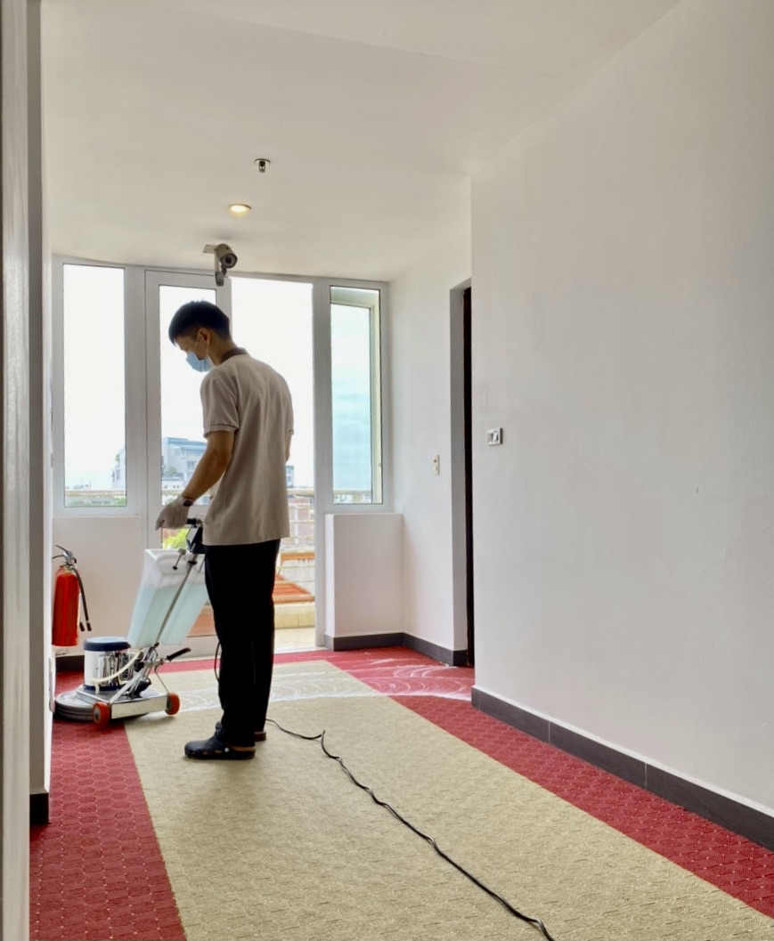 • Các khu vực sử dụng chung của khách sạn bao gồm thang máy, ghế, nhà vệ sinh, tay nắm cửa, thảm...được khử trùng liên tục bằng dung dịch cồn.